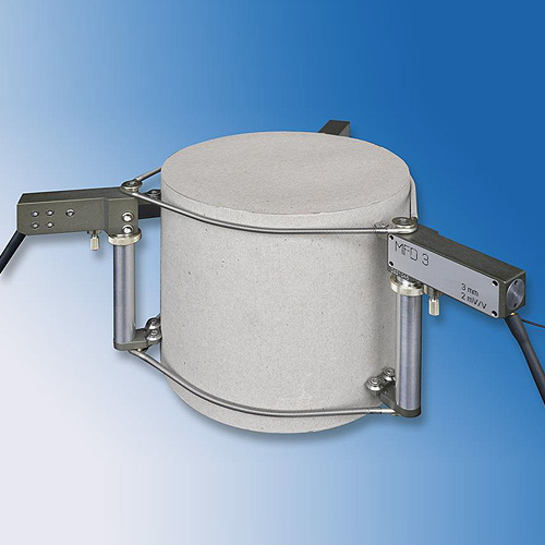 The extensometer system MFD is suitable to determine the strength of pressure (ASTM D-2938) or the modulus of elasticity respectively (ASTM D-3148) of concrete cylinders or rectangular prism under longitudinal compressive stress. The application is carried out with two, three (as shown on the picture) or four gauge lines.